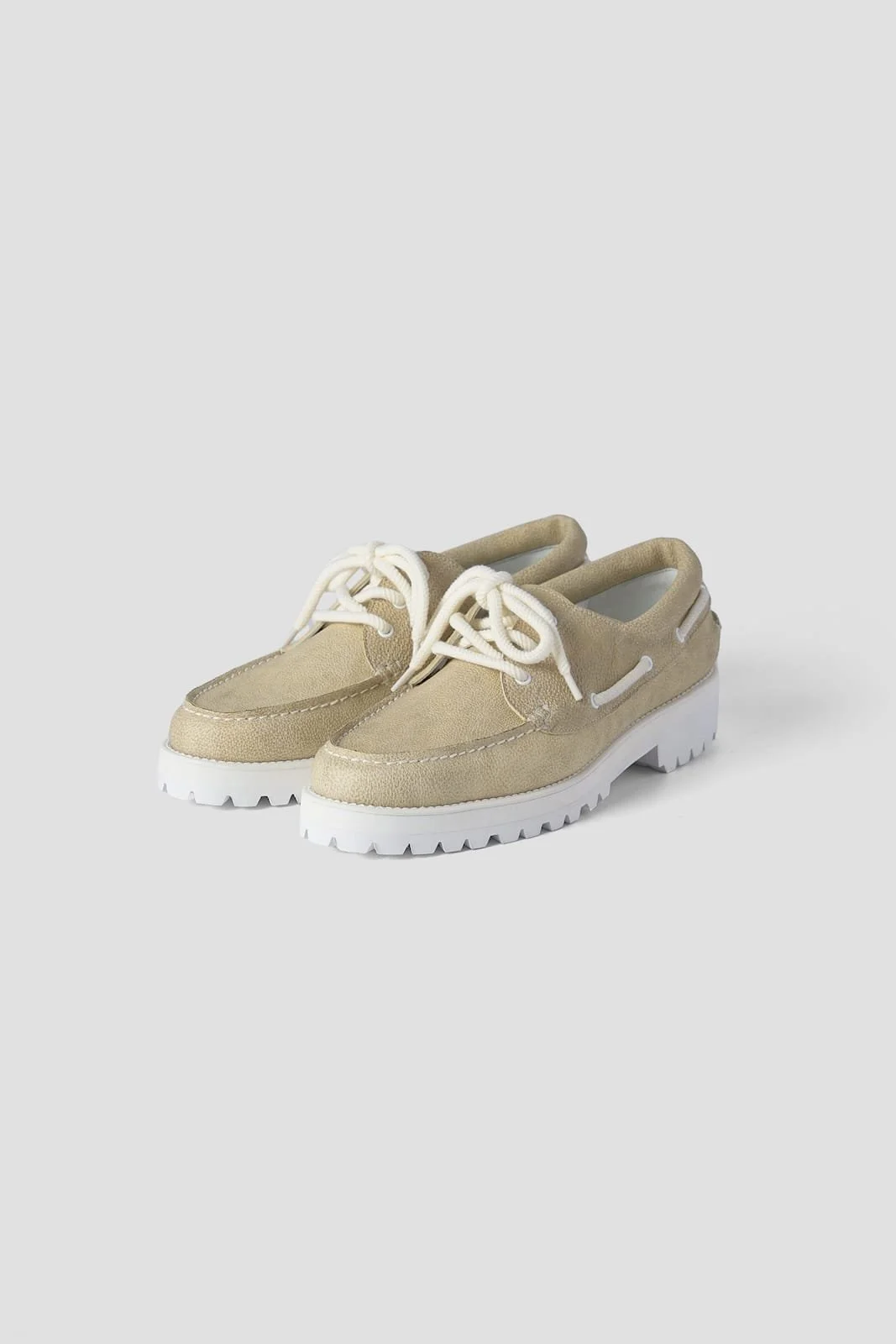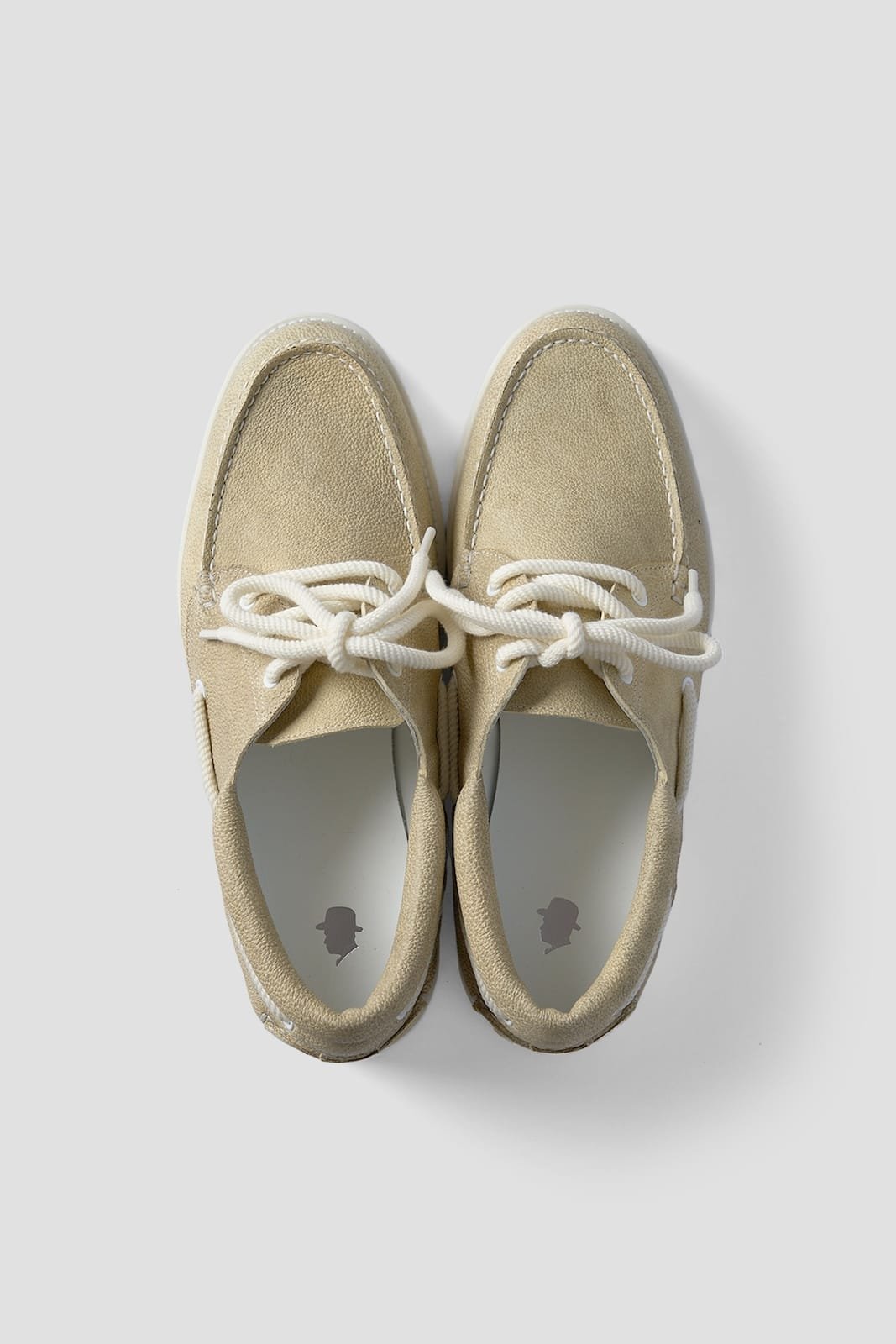 白鞣しの素材感を活かし、トラディショナルでベーシックなデザインに落とし込んだシューズ。Tomo&Co.が掲げるブランドコンセプト「A PAIR BRICOLAGE」のもと、デザイナー・小野崎が白鞣しの工房に足を運び、五感で感じ取ったものが反映されている。左右で異なる白鞣しの表情が印象的。