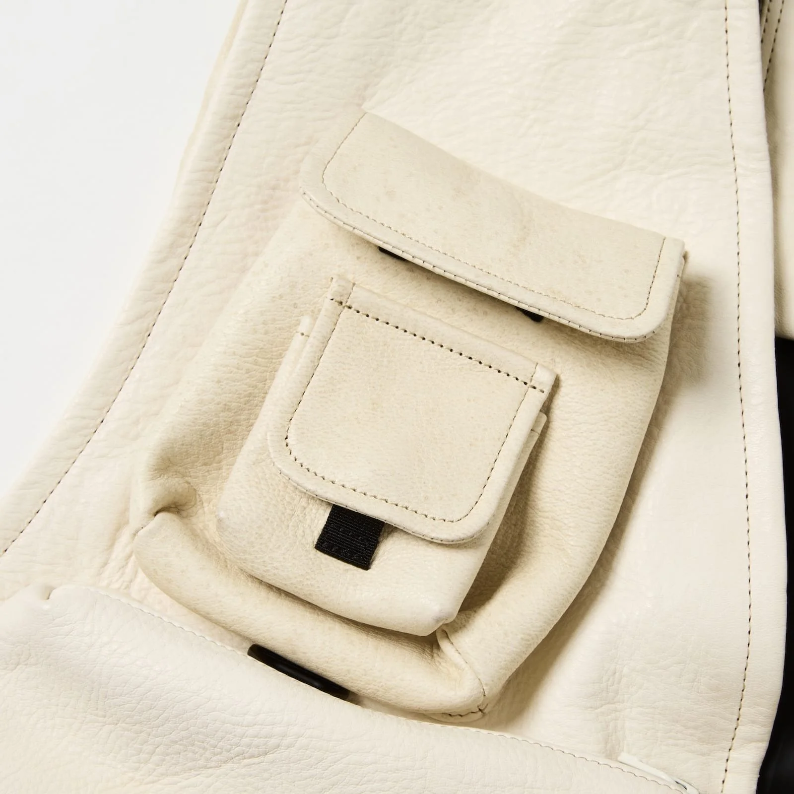 白鞣し革とは、薬品を一切使用せず、塩と菜種油のみで仕上げた動物本来の肌色の革のこと。一度は途絶えかけた白鞣しの技術を、現代の鞣し革職人 新田眞大氏が復活させた。歴史に裏打ちされたクラフツマンシップは、「究極=完成されていない」と話されていた。これらは下地であり、無垢であるために、あらゆる可能性を湛えている。